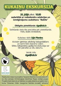 20. jūlijā aicinām uz otro projekta “Iepazīsti Babītes novada dabu! II” pasākumu – kukaiņu ekskursiju, kas notiks sadarbībā ar rododendru selekcijas un izmēģinājumu audzētavu “Babīte”. Kukaiņus rādīs entomologs Uģis Piterāns. Pasākumā būs iespējams uzzināt par dažādiem kukaiņiem, kas dzīvo mums visapkārt, kā arī priecēt acis ar skaistajiem dienas tauriņiem. Ekskursijas laikā tiks organizēta viktorīna par Babītes novadu, vēsturi un dabu.