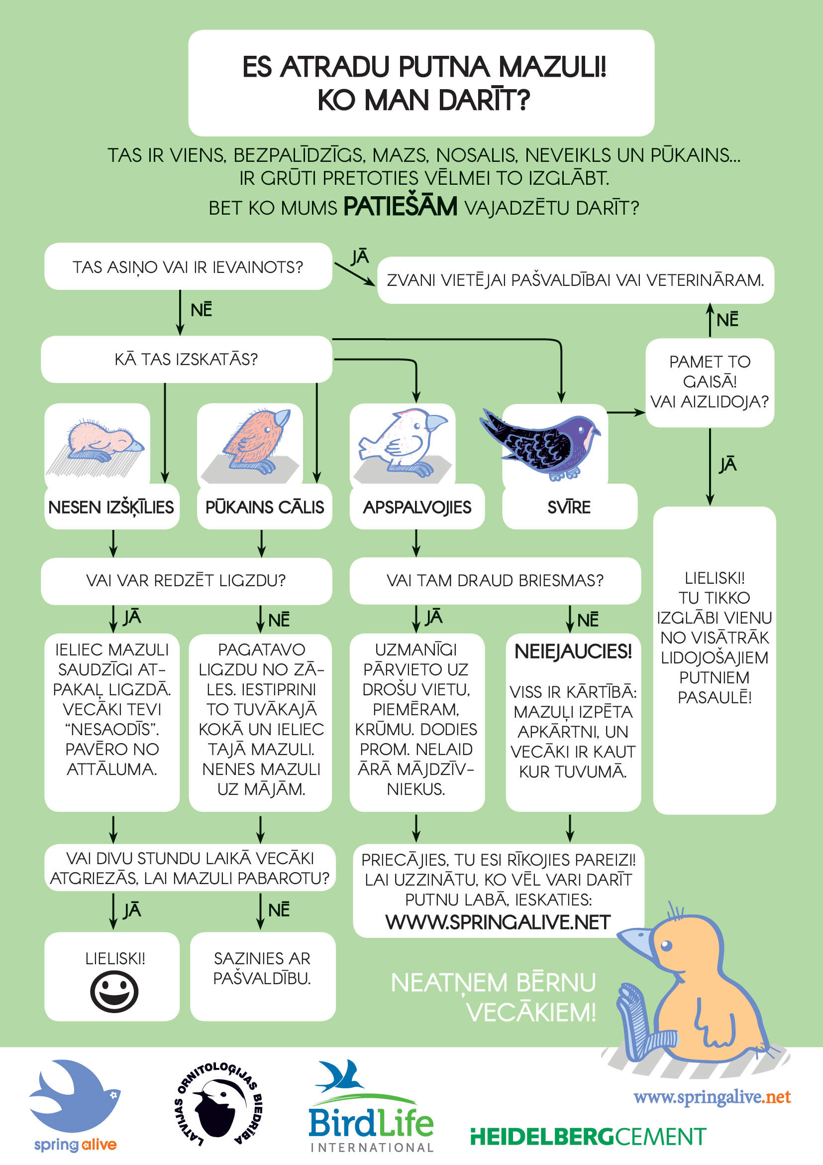“Sastopot svešu bērnu, paturēsim prātā, ka neviens par to neparūpēsies labāk kā tā vecāki, un atcerēsimies arī to, ka bērnu nolaupīšana ir sodāms pārkāpums. Un, jā, tas attiecas arī uz putnu mazuļiem,” uzsver ornitologs Viesturs Ķerus. Ligzdas postīšana ir likuma pārkāpums. Ja kāds no ligzdas zog olas vai putnēnus vai ja tuvējā apkaimē tiek iznīcināta svarīga ligzdošanas vieta, par to nekavējoties ir jāinformē Dabas aizsardzības pārvalde.