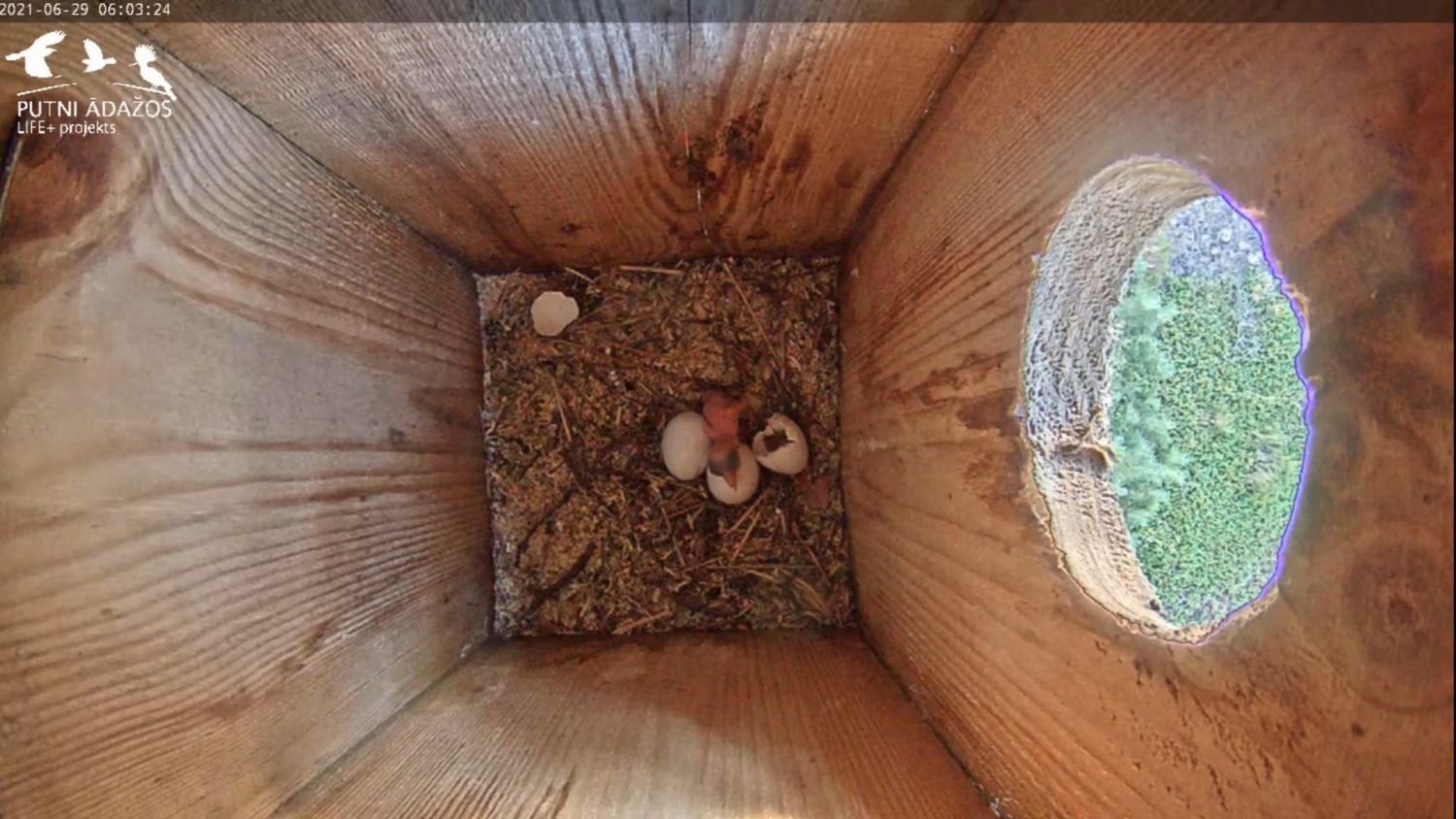 “Šogad tiešraidē varam vērot jaunā zaļo vārnu pāra ģimenes dzīvi. Pārim – vienu gadu vecajai zaļo vārnu mātītei un divus gadus vecajam zaļo vārnu tēviņam – ir trīs olas, no kurām jau ir izšķīlušies pirmie mazuļi, par kuriem vecāki turpina rūpēties, piegādājot tiem barību, vaboles, sienāžus, siseņus, zirnekļus,” stāsta Ādažu poligona vides aizsardzības koordinatore Ieva Mārdega. Šai putnu būrī, kas aprīkots ar tiešraides kameru, zaļās vārnas ligzdojušas vairākas reizes un šogad ir vērojami arī tās mazuļi.
