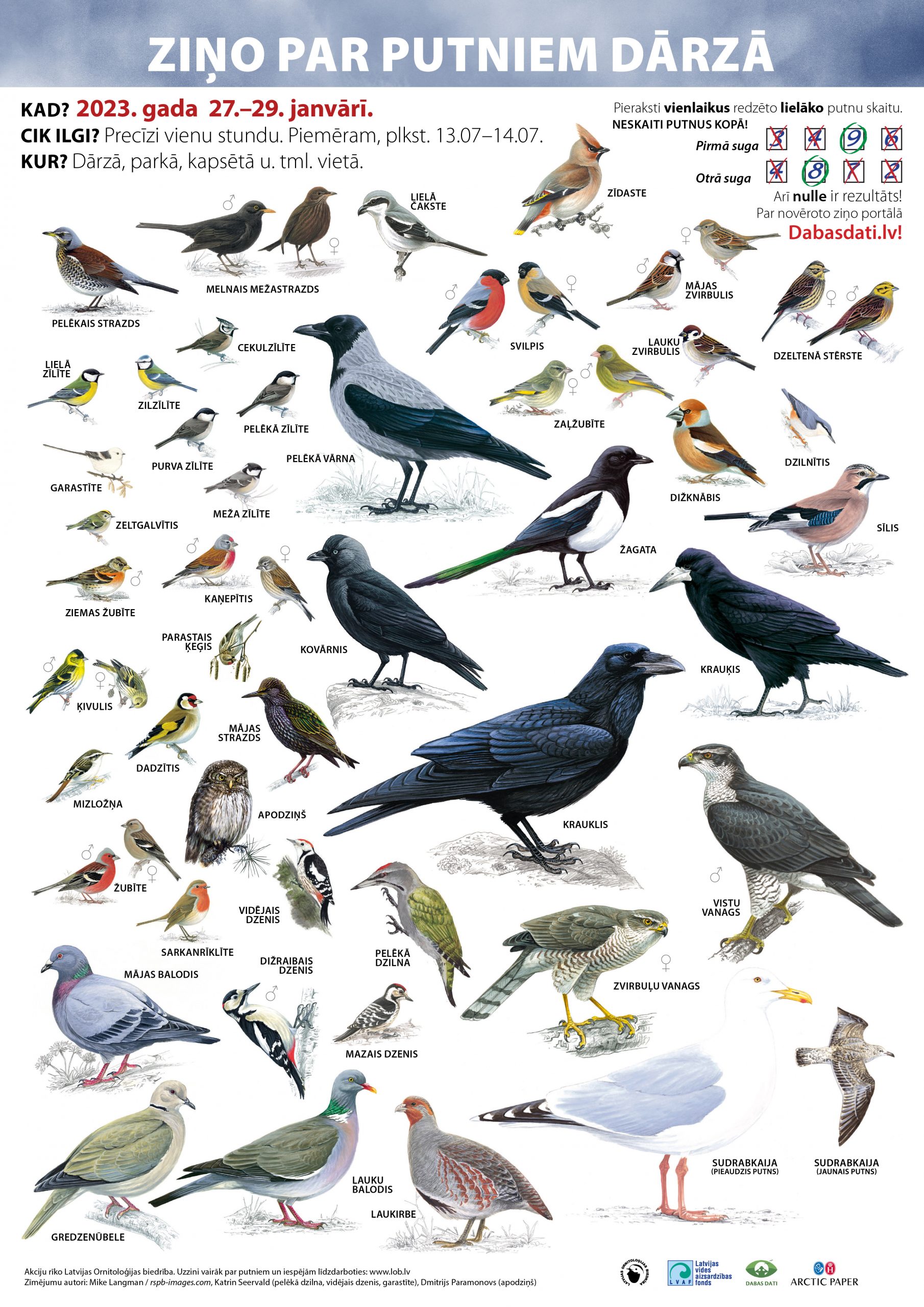 Lai apzinātu, kur un kādas putnu sugas Latvijā sastopamas ziemas mēnešos, Latvijas Ornitoloģijas biedrība no 27. līdz 29. janvārim aicina ikvienu stundas garumā piedalīties akcijā “Ziņo par putniem dārzā 2023”. Šajos pašos datumos pēc vienotas metodikas putnus skaitīs gan kaimiņvalstīs, gan citviet Eiropā.