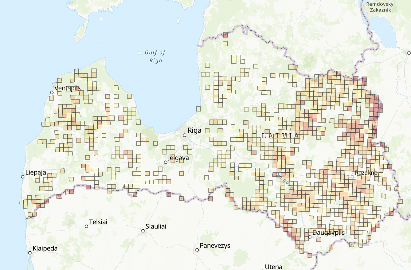 Interaktīvā karte https://arcg.is/19invn0 atklāj to, no kuriem kvadrātiem visvairāk tiek gaidīti putnu balsu ieraksti: jo kvadrāts ir tumšāks, jo mazāk par to ir informācijas un datu, līdz ar to jo vērtīgāks ir audiopiecminūtes ieraksts no šīs teritorijas.