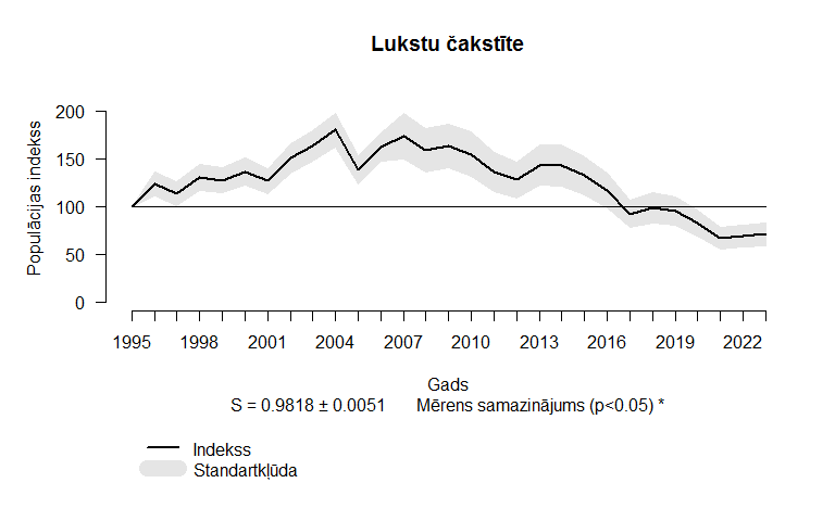 “Pētījuma rezultāti liecina, ka, neraugoties uz Eiropas Savienības vides tiesību aktiem, kuri vērsti uz apdraudēto sugu populāciju stāvokļa uzlabošanu, lauku putnu populācijas sarūk,” uzsver pētījuma līdzautors Latvijas Ornitoloģijas biedrības ligzdojošo putnu uzskaišu zinātniskais vadītājs Dr. biol. Ainārs Auniņš, vienlaikus izsakot pateicību brīvprātīgajiem putnu uzskaišu veicējiem Latvijā. “Viena no sugām, kurai populācija pieauga līdz 2004. gadam, bet pēc tam seko samazinājums, kas ir īpaši straujš pēdējos desmit gados, ir lukstu čakstīte. Šai sugai ir vajadzīgas zālāju un atmatu platības, kas ir gājušas mazumā.”
