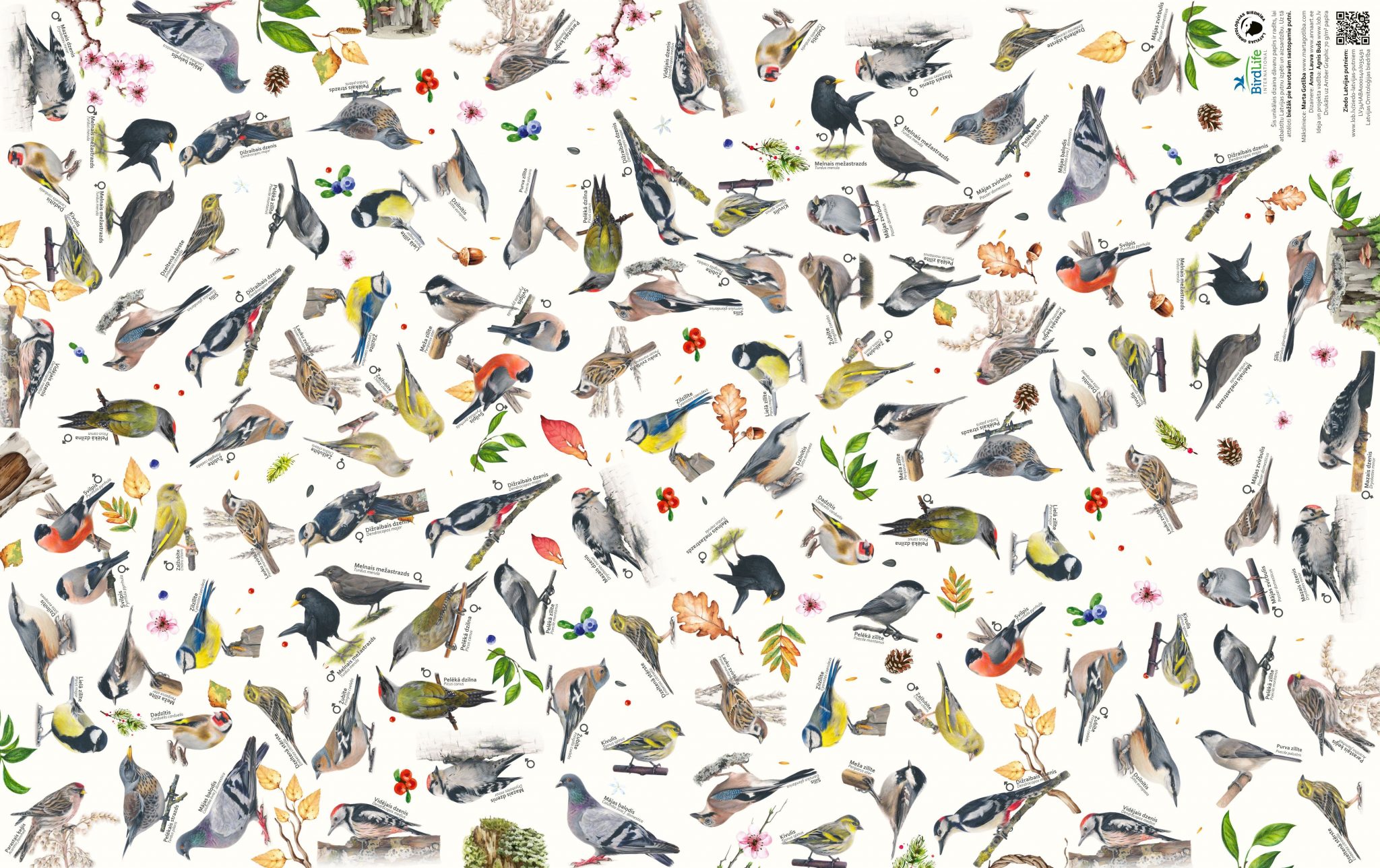 Apritīgi radīts dāvanu papīrs ar Latvijas dabā sastopamu putnu sugu ilustrācijām