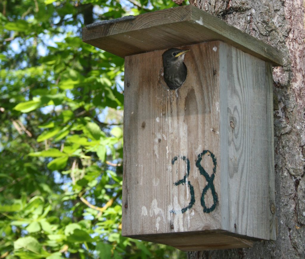 Titulattēlā: mājas strazds putnu būrī, kas izvietots Zeltalejas parauglaukumā. Foto: Oskars Keišs.