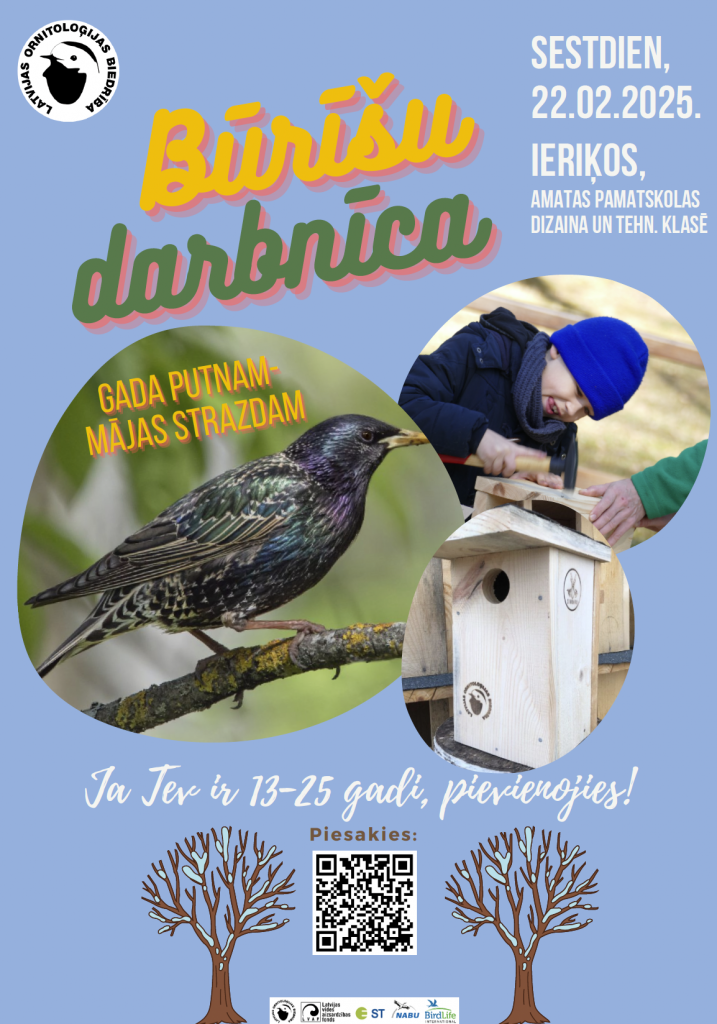 Sestdien, 22. februārī, Ieriķos norisināsies LOB Jauniešu ligzdas piektā sanākšana, kurā jauniešiem būs iespēja iepazīt 2025. gada putnu mājas strazdu un izgatavot tam putnu būri. Uz pasākumu ir aicināti interesenti vecumā no 13 līdz 25 gadiem.