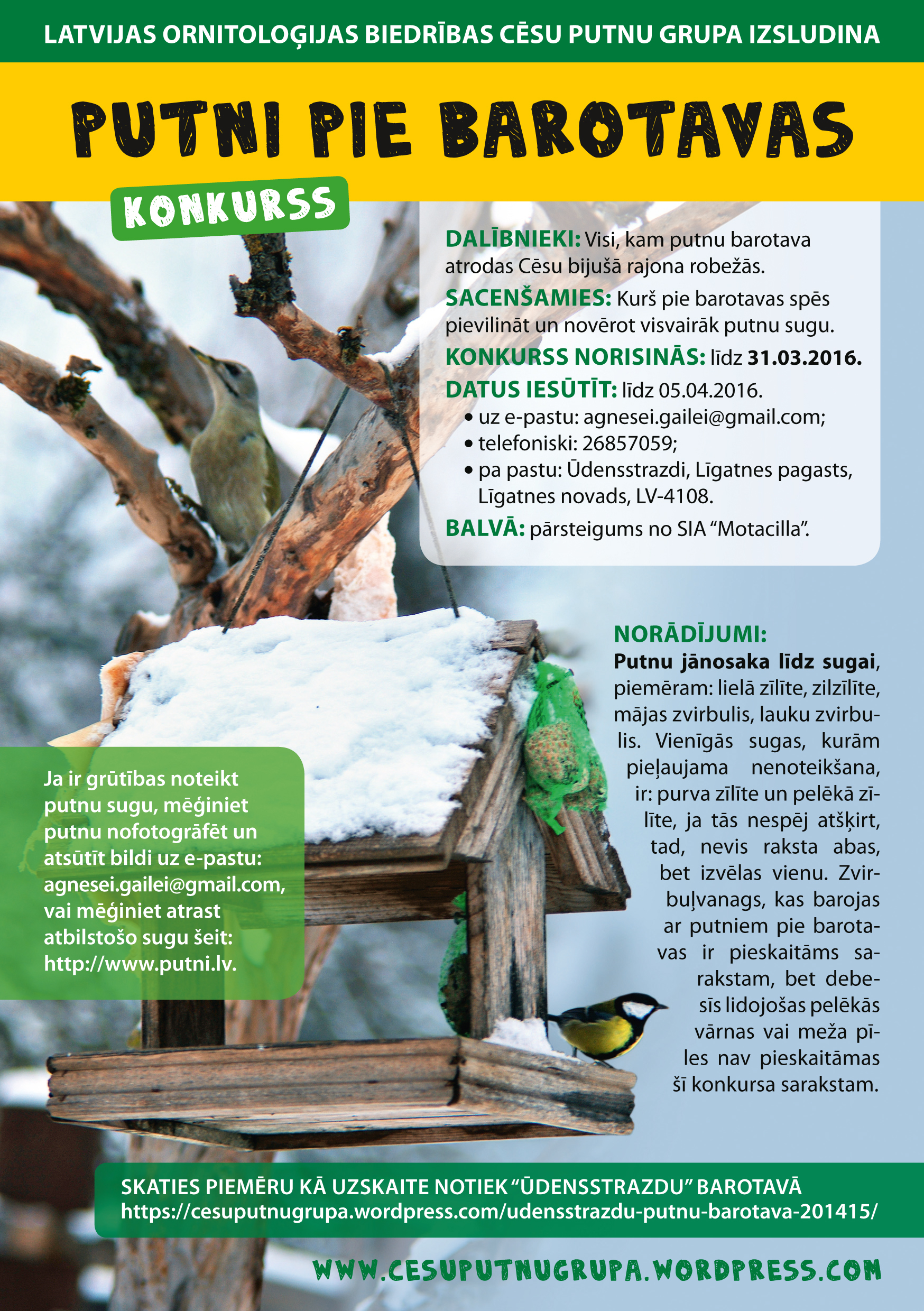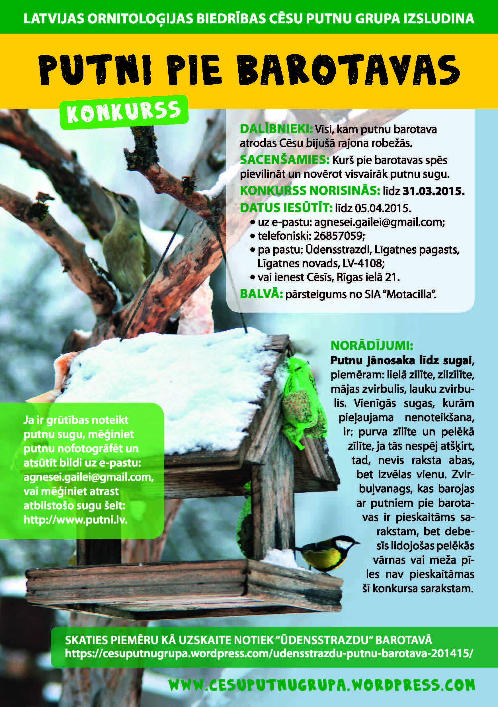 Turpinās konkursa 2. kārta (01.01.2015. – 31.03.2015.) – aicinām visus 1. kārtas dalībniekus turpināt vērot putnus pie barotavām un skaitīt klāt “jaunpienācējus” jau esošajam sarakstam kā arī ļoti gaidām jaunus konkursa dalībniekus veidot savus novēroto putnu sugu sarakstus (Konkursa nolikums)! Rezultātus lūdzam iesūtīt e-pastā: agnesei.gailei@gmail.com līdz 05.04.2015. Uzvarētājam – pārsteiguma balva no SIA “Motacilla”!