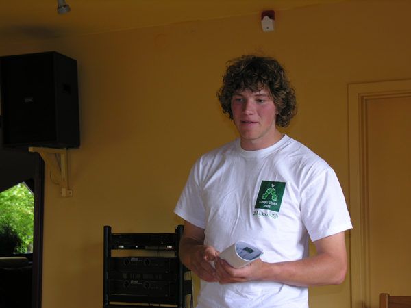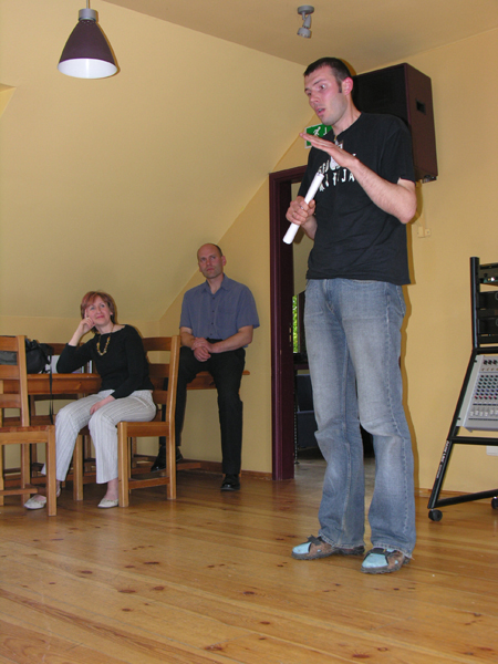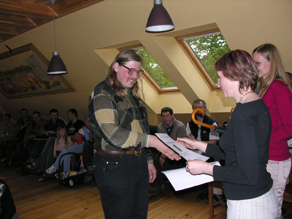 Tiek pasniegta balva vienam no "Torņu cīņu" uzvarētājiem - komandas "Trīs sivēntiņi" dalībniekam G. Graubicam.  Foto: P. Strautiņš.