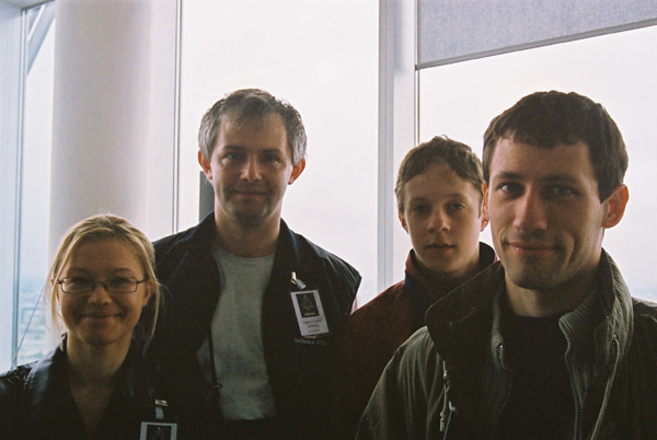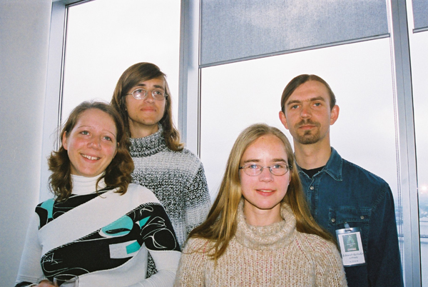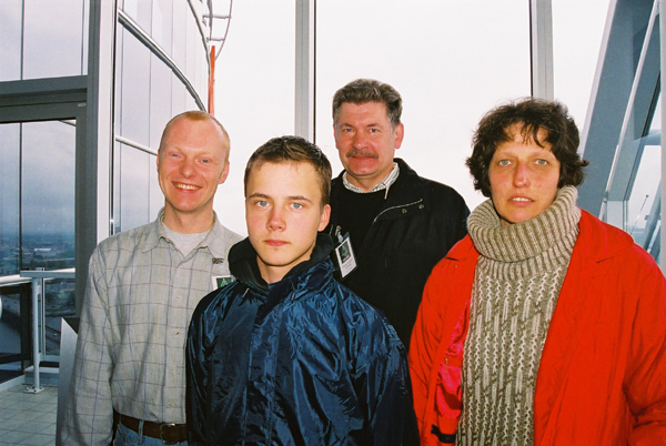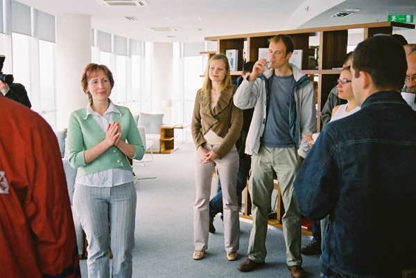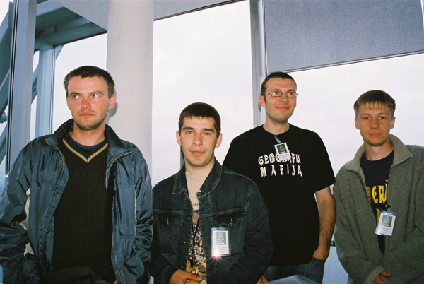 Komanda “Trīs sivēntiņi” sacensību atklāšanā Hansabankas biroja ēkā – vienā no augstākajiem Latvijas “torņiem”.