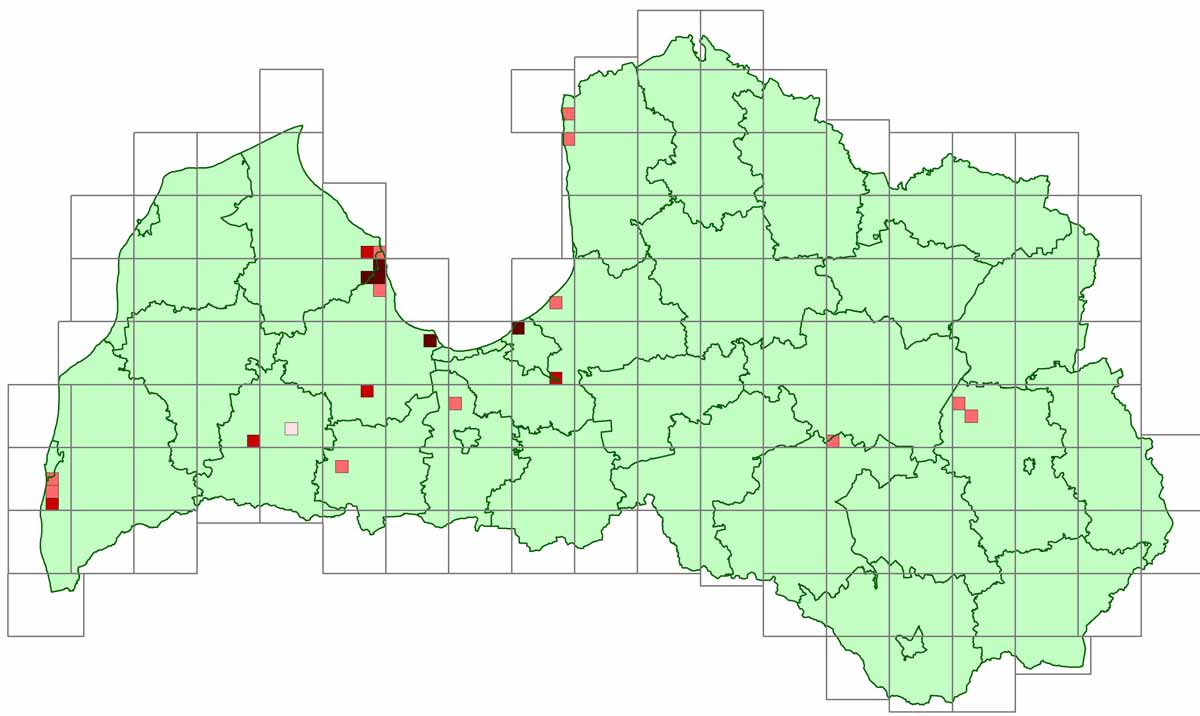 Bārdzīlīte Panurus biarmicus Home Projekti Latvijas ligzdojošo putnu atlants Latvijas ligzdojošo putnu atlanta rezultāti Sugu izplatības kartes Bārdzīlīte Panurus biarmicus
